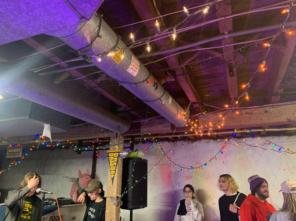 The concert roars at full force in the basement of Lucky Aide. Well, really, it’s a laundry room, fit with a washer-dryer in the back where the bands have their guitar cases and extra amps sprawled out. It’s a glorified half-finished bunker of sorts that doubles as a catch-all storage and supply space adorned with fairy lights. The stage is marked by amps at the far side of the room, an area rug, and Christmas lights fastened around the ceiling pipes.